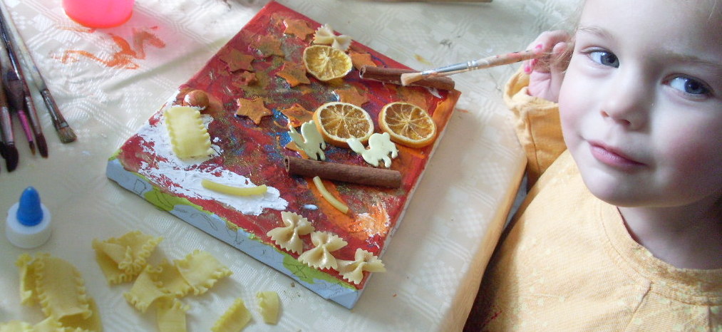 Keilrahmen mit Moos, Stöckchen und anderen Fundstücken bekleben und frische Farbe auf das Bild bringen. Goldpulver darüber streuen und fertig ist das Fundbild. Tipp für den Frühling: Moos und Stöckchen, vielleicht den einen oder anderen Kunstschmetterling einfügen und fertig ist das Frühlingsbild.